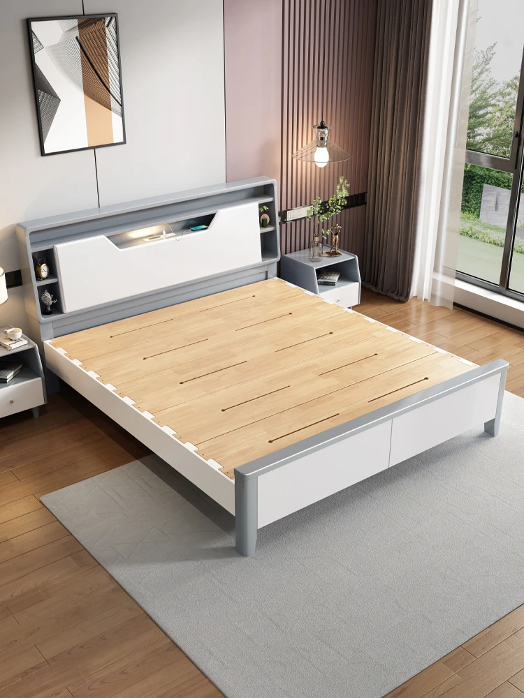 モダンシンプルな1.8m全実木製ダブルベッド - 榫卯構造で収納力抜群!ホワイトカラー、工場直販でお得に手に入れよう!主寝室にぴったりの高品質ベッド。