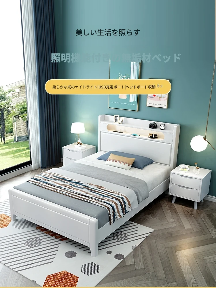 北欧スタイルのソフトパッケージナイトライト付き、1.8mの天然木製ベッド。モダンでシンプル、小型住宅にも最適!1.2m/1.5mのシングル・ダブル収納ベッドで、快適な睡眠空間を実現します。