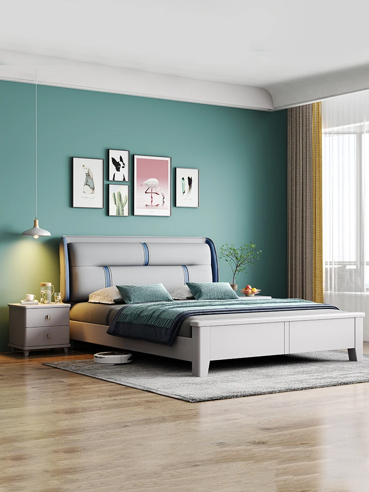 モダンシンプルなソフトパック仕上げの無垢材ベッド、ホワイト1.8m、主寝室用ダブルベッド1.5m、ラグジュアリーな収納付き婚礼用家具。シンプルで洗練されたデザインで、快適な眠りを実現!