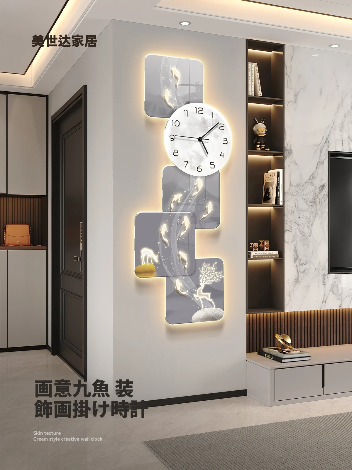 美世达のモダン軽奢ソファ用背景壁装飾画 - 高級感溢れるリビングルームにぴったりの九匹の魚のアートと時計壁画で、おしゃれな空間を演出!