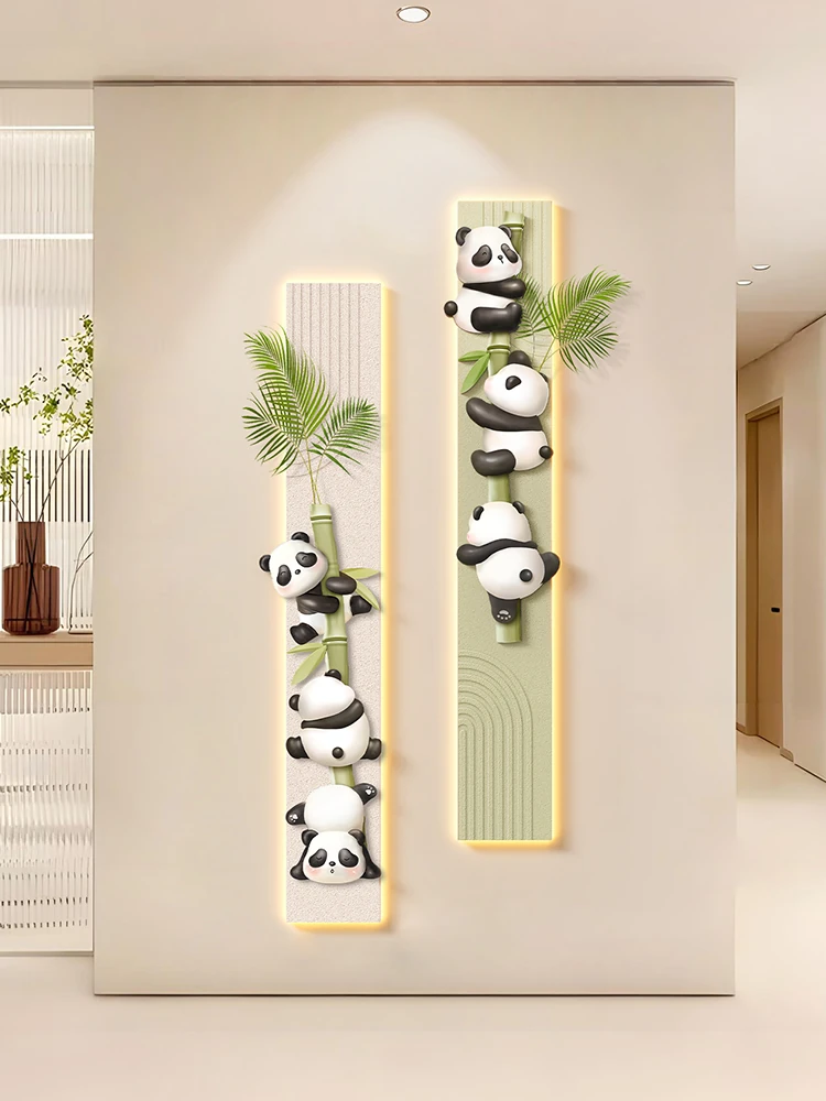 クリーミーなパンダのエントランス装飾画 - 緑の植物と組み合わせた長方形の廊下用ウォールアート。玄関のドア正面にぴったりの壁画で、あなたの家をおしゃれに演出します!