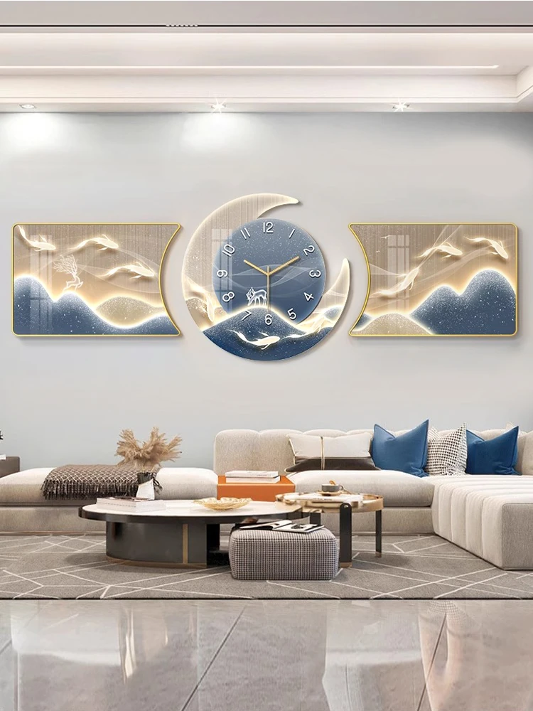 2024年新作!九魚の壁画と時計が美しいリビングのソファ背景を演出する三連アート。お部屋に華やかさと時間を刻む魅力的なインテリアをプラス!