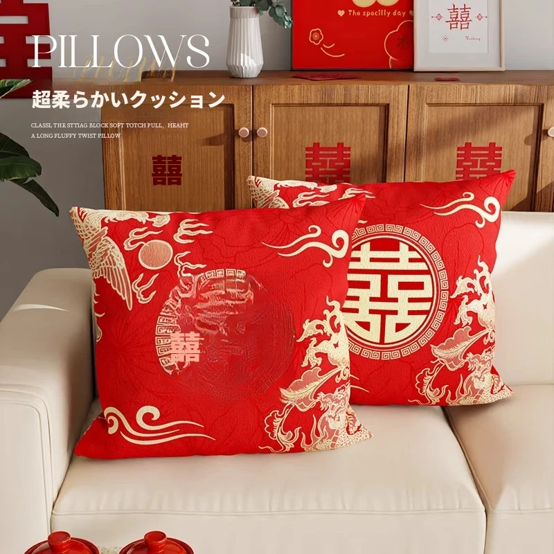 美世达結婚祝いの喜字クッション - リビングやソファにぴったりな赤色の抱き枕。新婚生活を華やかに演出する高級感あふれる装飾アイテム!新居のコーディネートにも最適!