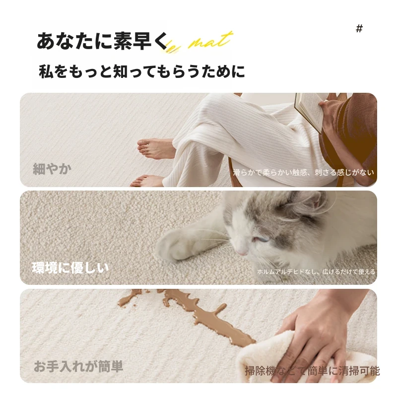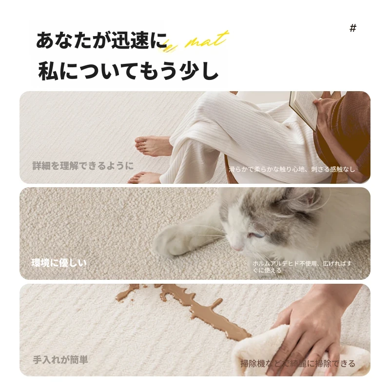 メイシーダのクリーム風カーペット2024新作!ソファの下でも使える、洗わずに拭くだけの便利なルームマット。寝室やリビングにぴったりなベッドサイドマットで、快適な空間を演出します。