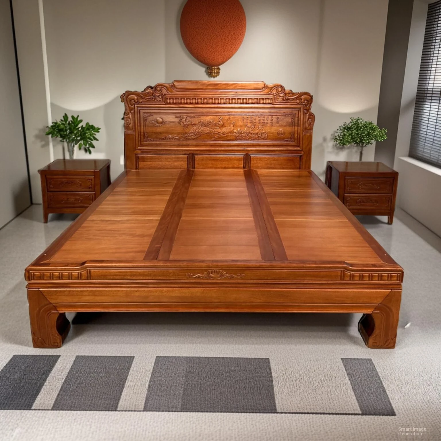 Classic Chinese Solid Wood Bed - 2m King Size with Mortise and Tenon Joinery, Exquisite Carvings, Made of Golden Pear Wood and Pineapple Wood, Ideal for Master Bedrooms