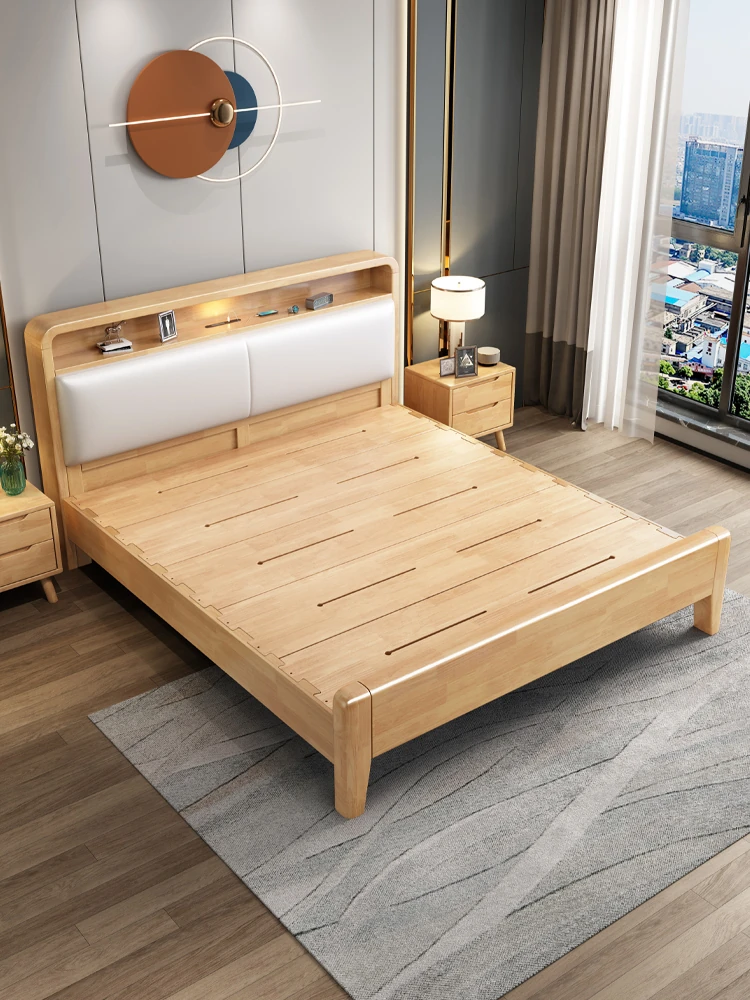 Nordic Solid Wood Bed with Soft Headboard and Night Light - 1.8m Modern Minimalist Storage Bed for Small Spaces in Natural Wood Finish
