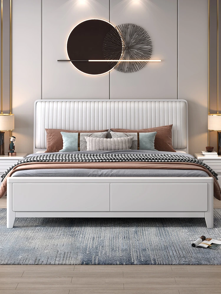Modern Minimalist White Solid Wood Bed with Soft Headboard - 1.8m Double Bed for Main Bedroom, Space-Saving High-Storage Design for Small Apartments, Perfect Wedding Bed