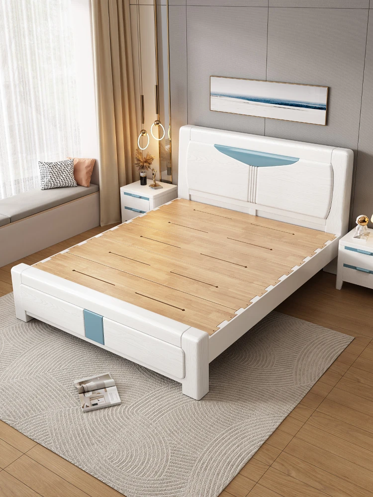 Modern Minimalist Solid Wood Bed - White Mortise and Tenon Structure, 1.8m King Size Double Bed for Master Bedroom, Oak Storage Single Bed - Perfect for Stylish and Functional Living Spaces!
