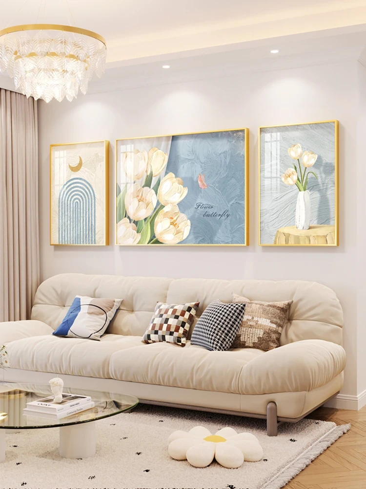 2024 New Elegant Cream Living Room Sofa Background Wall Art - Luxurious Three-Panel Tulip Canvas Print for Sophisticated Décor