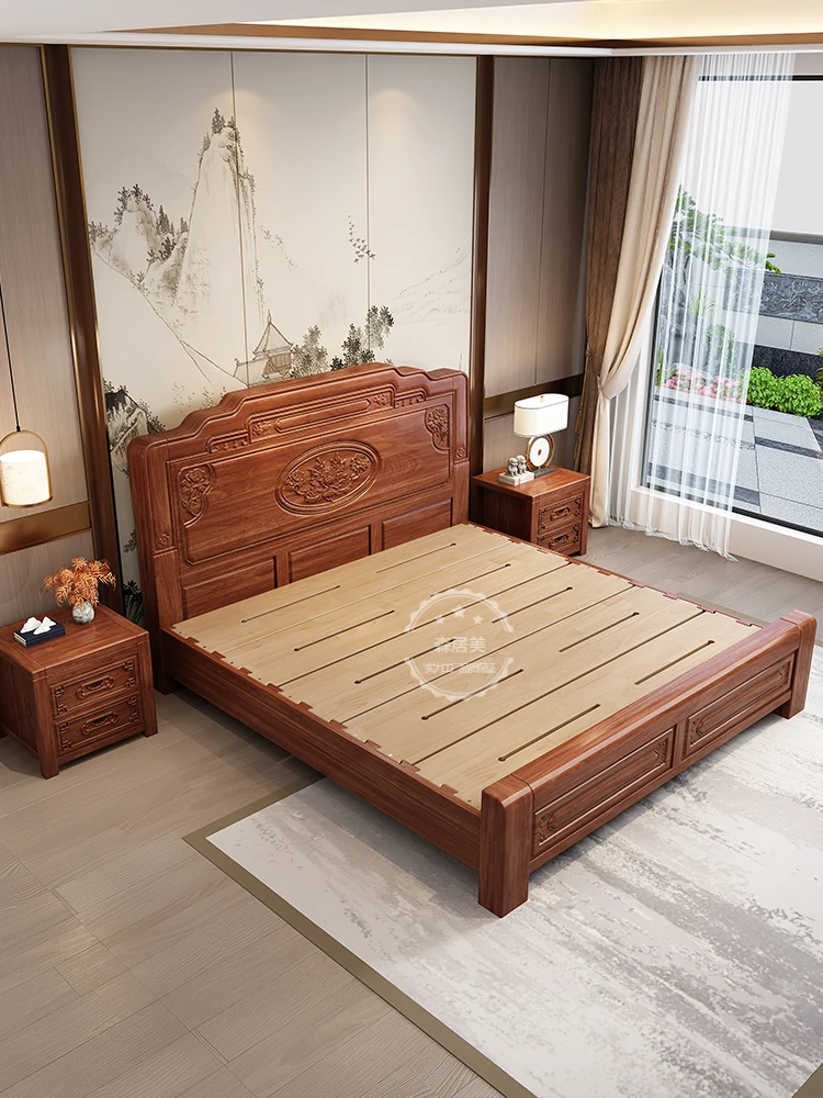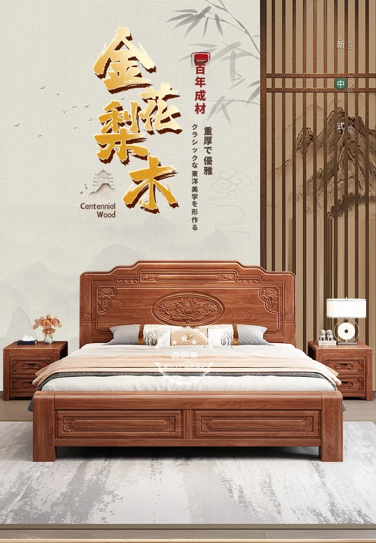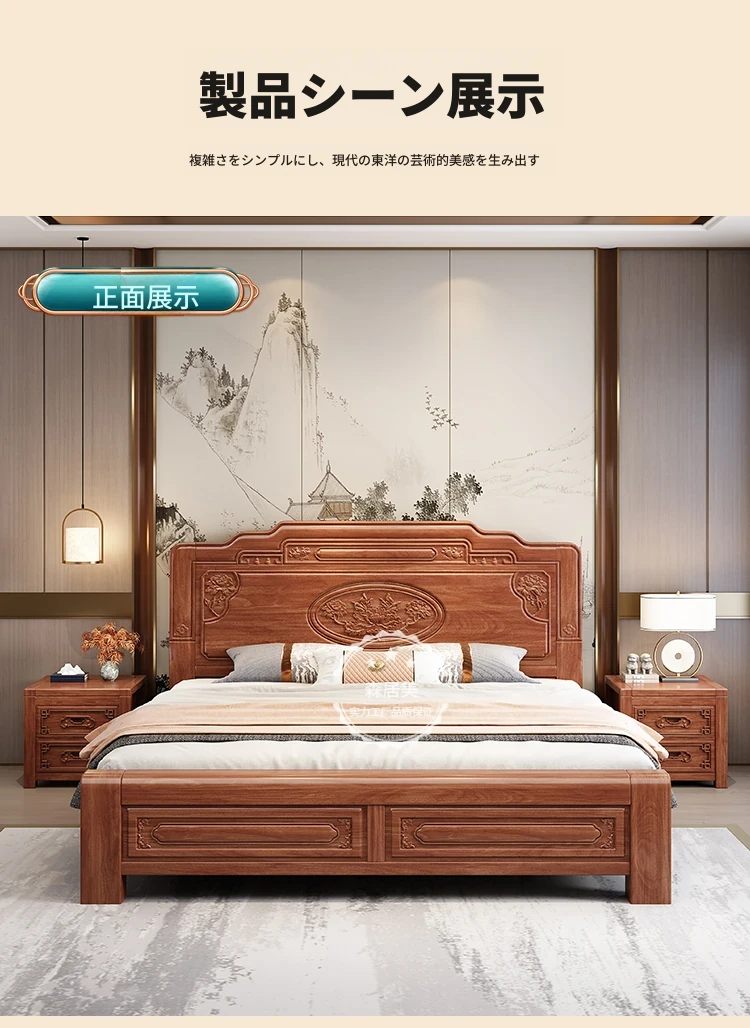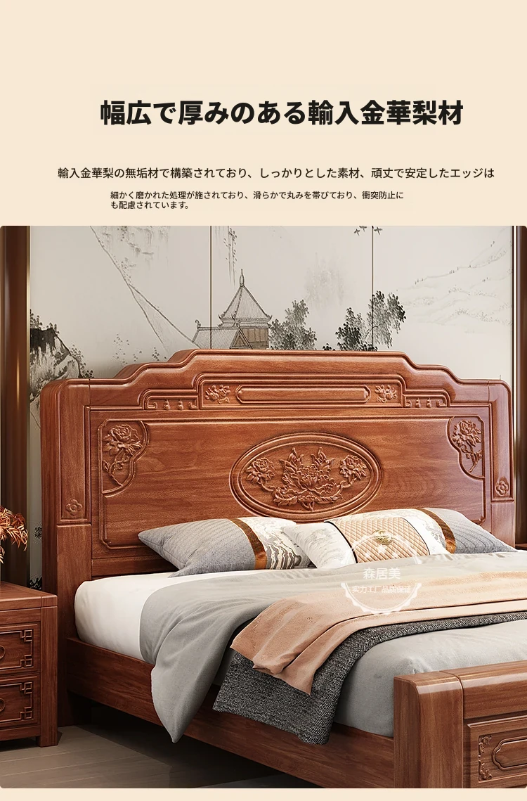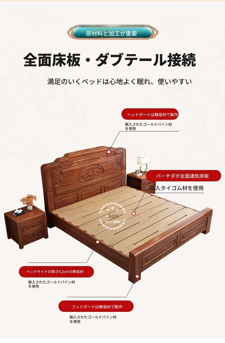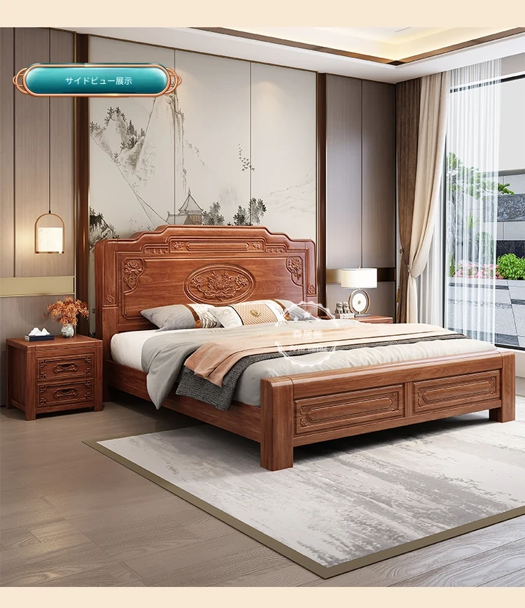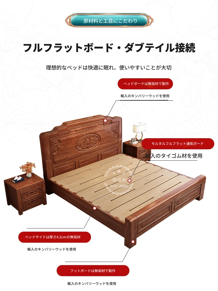 高級金花梨木全榫卯構造!1.8米中式古典彫刻主寝室用ダブルベッド - 菠萝格赤木床で優雅な空間を演出!