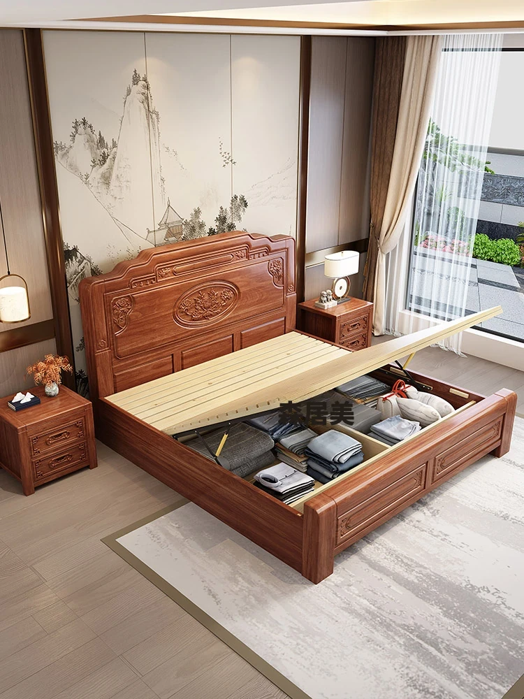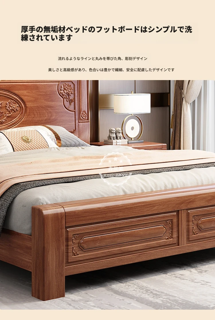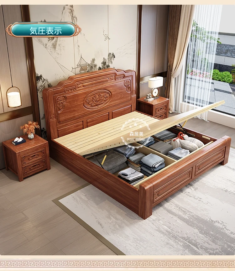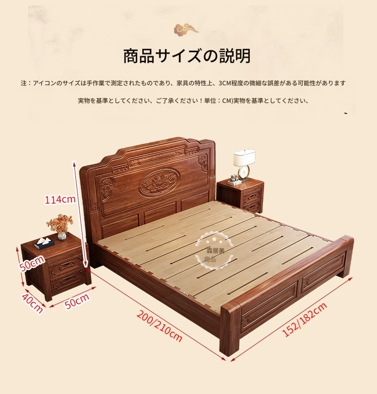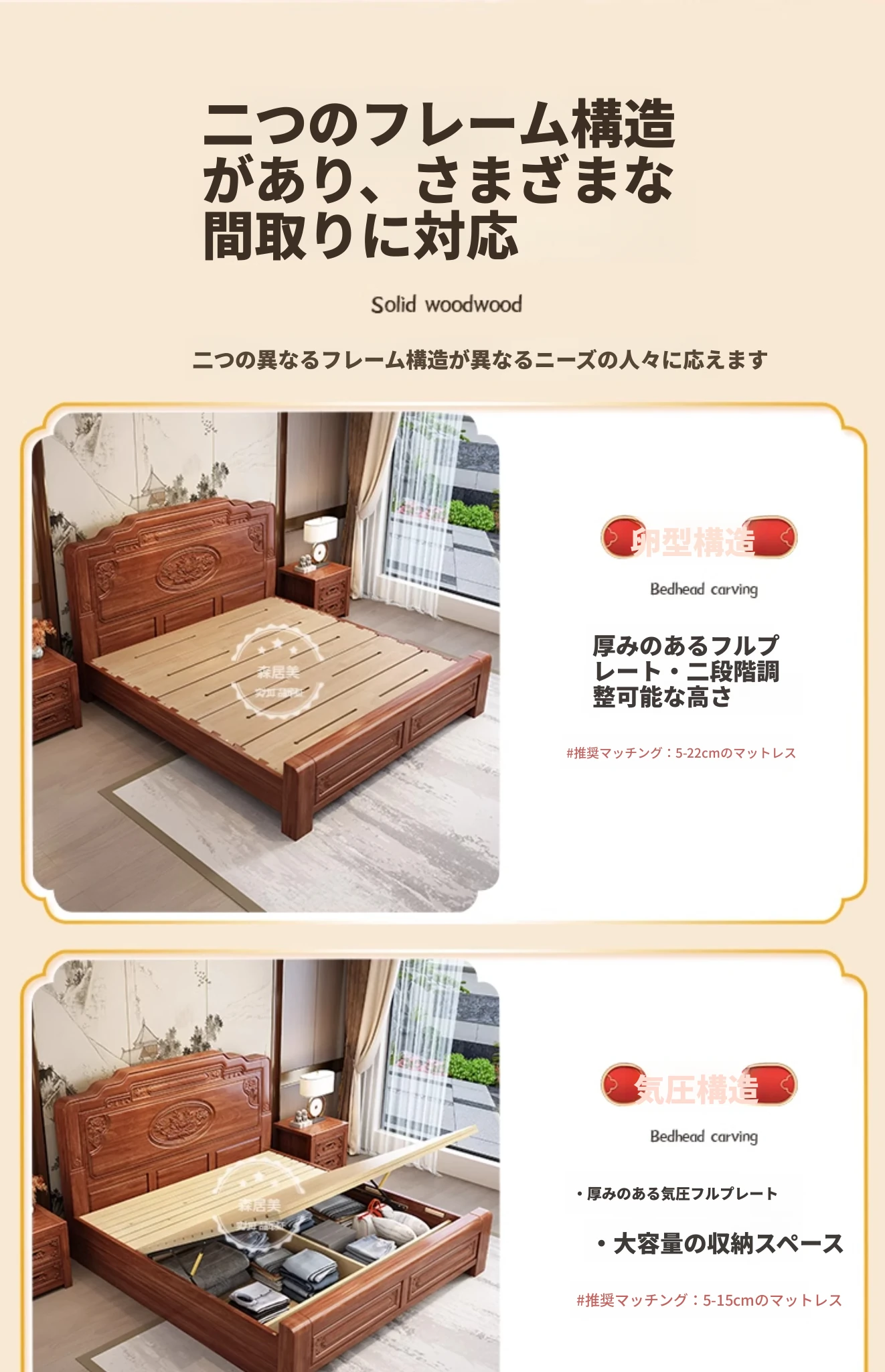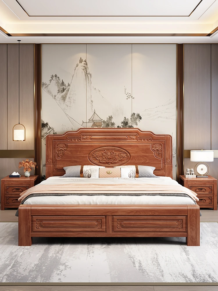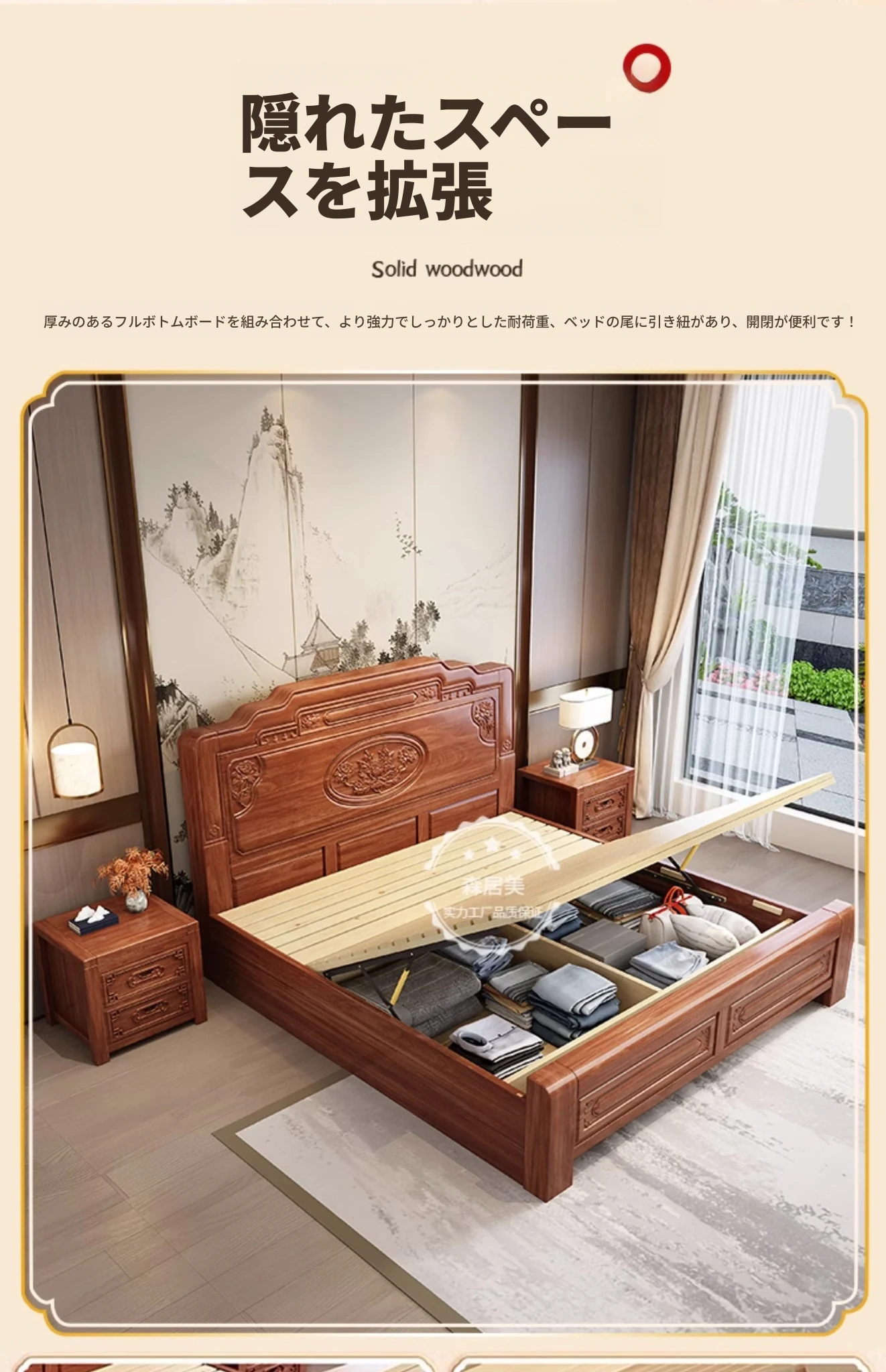 高級金花梨木全榫卯構造!1.8米中式古典彫刻主寝室用ダブルベッド - 菠萝格赤木床で優雅な空間を演出!
