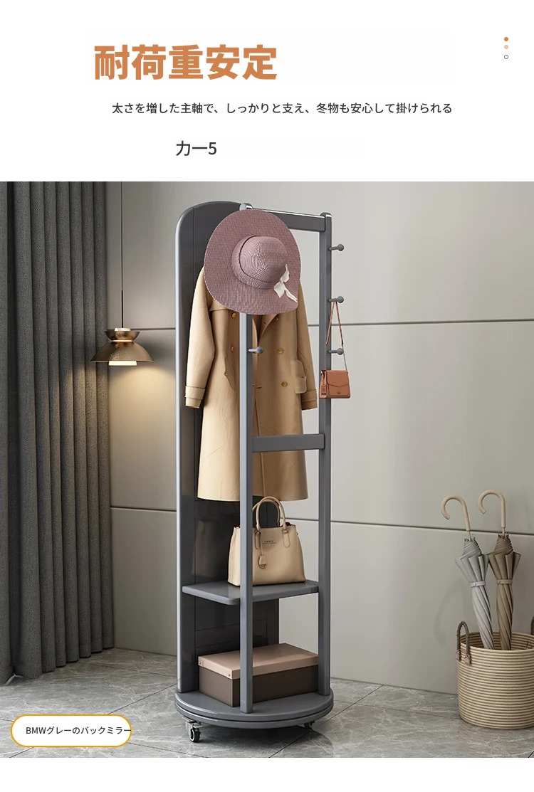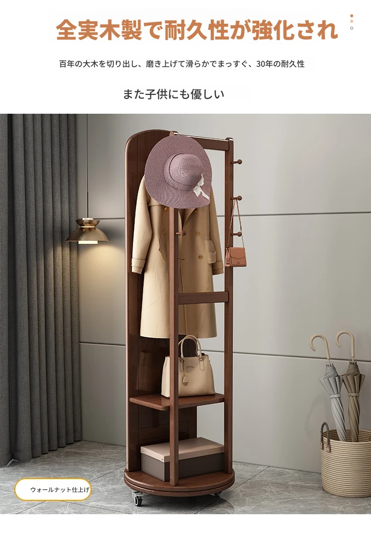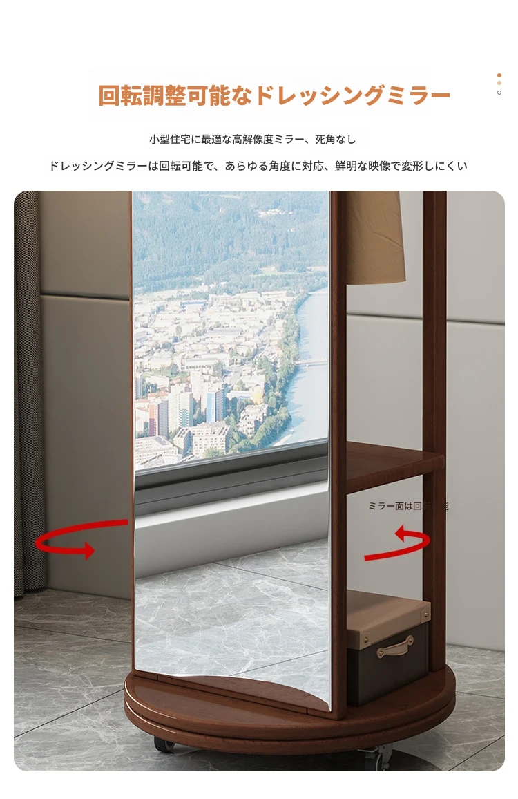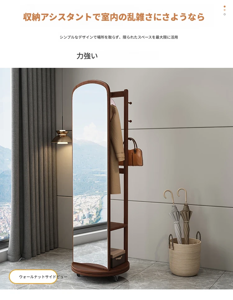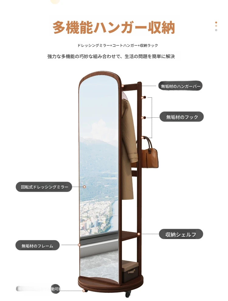 メイシーダ無垢材全身鏡 - おしゃれな衣類ハンガー一体型、回転式で移動もラクラク!寝室やリビングにぴったりな収納機能付き。あなたのスタイルを引き立てるアイテムです!