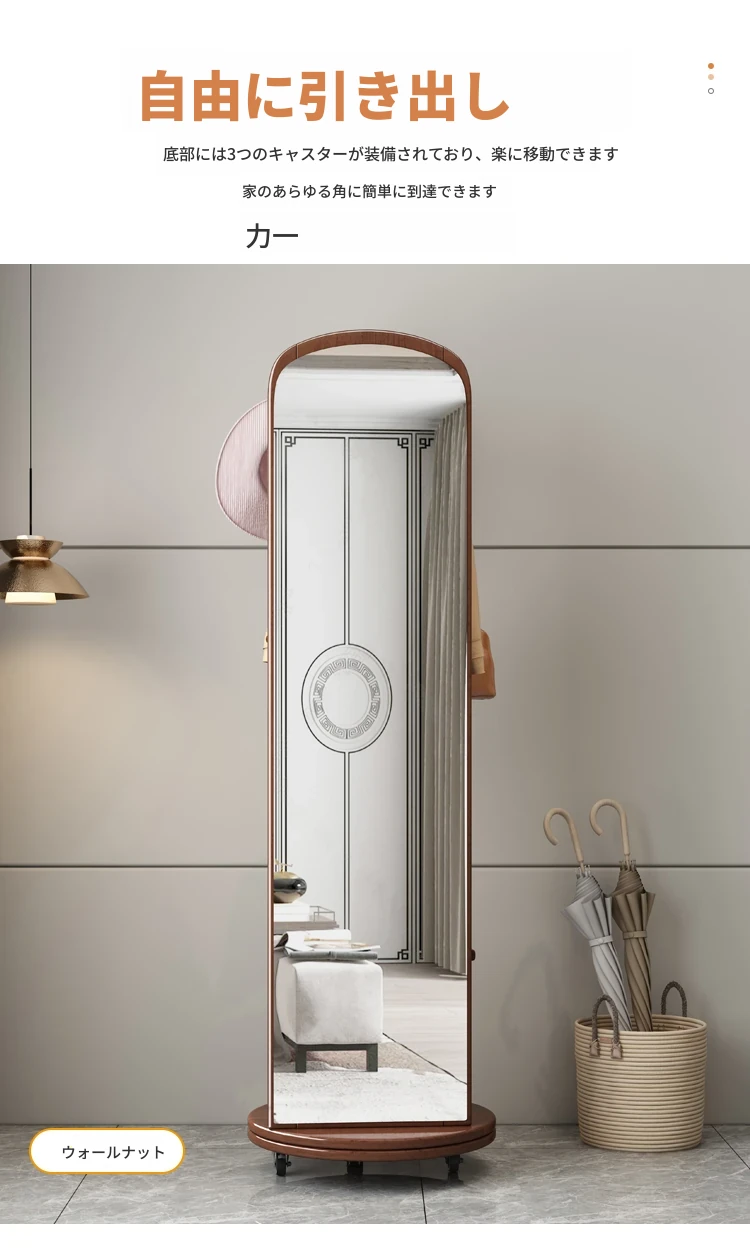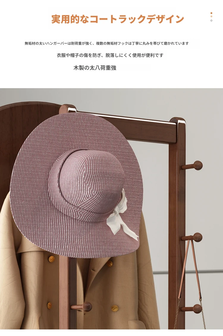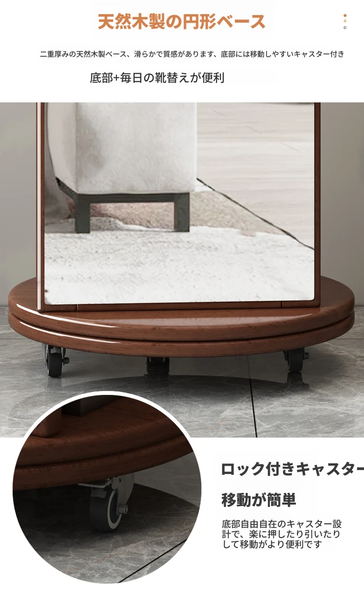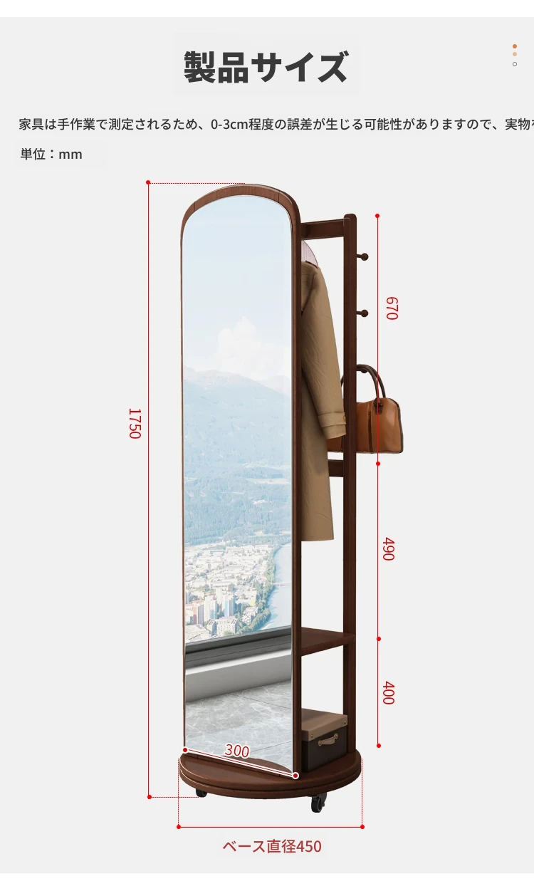 メイシーダ無垢材全身鏡 - おしゃれな衣類ハンガー一体型、回転式で移動もラクラク!寝室やリビングにぴったりな収納機能付き。あなたのスタイルを引き立てるアイテムです!