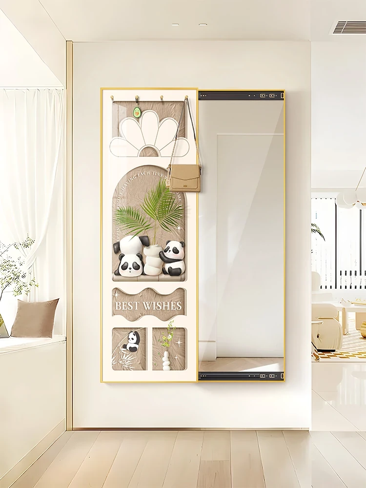 Panda-Inspired Hidden Dressing Mirror Creamy Wall Mural - Stylish Corridor and Entrance Decorative Art that Conceals a Full-Length Sliding Mirror