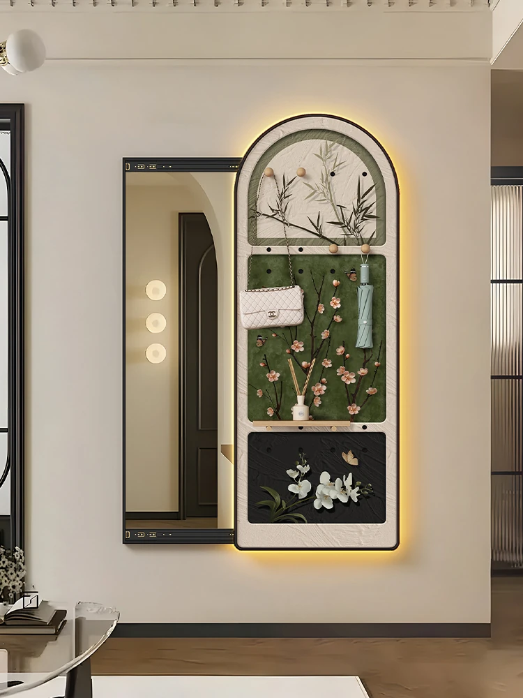 Elegant Hidden Full-Length Mirror with Decorative Artwork - Stylish Sliding Wall-Mounted Dressing Mirror with Pegboard Design for Entryway