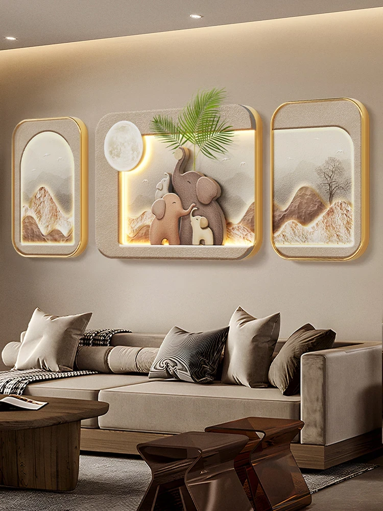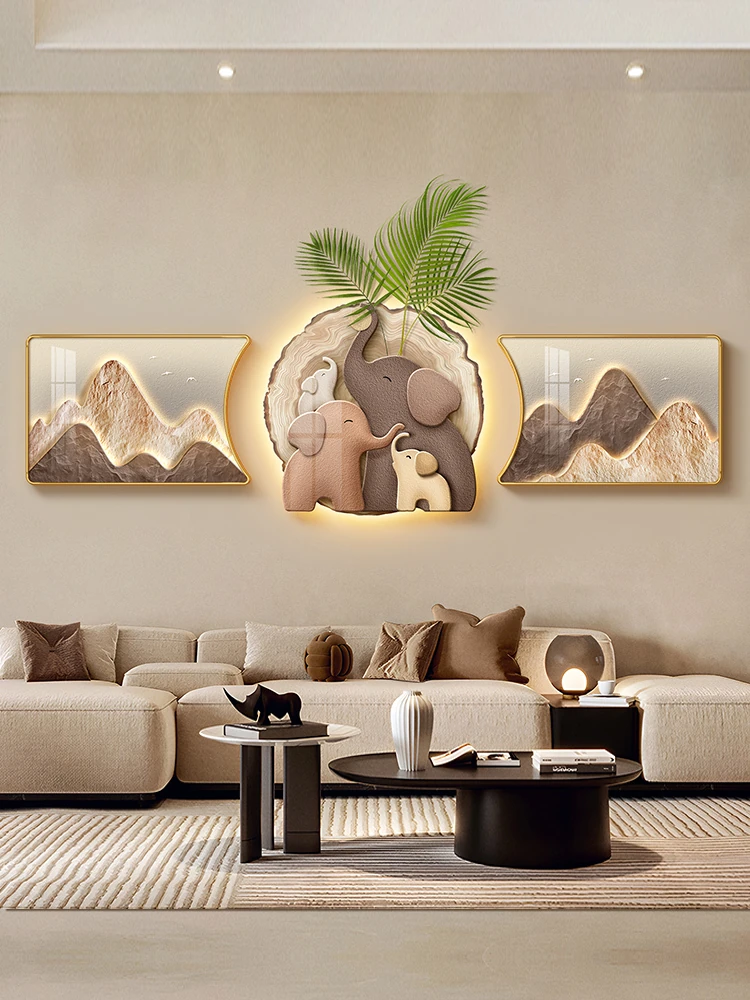 Elegant Wabi-Sabi Style Elephant Triptych Wall Art - Sophisticated Living Room Decor for Sofa Background, Featuring a Unique Light and Supportive Design.
