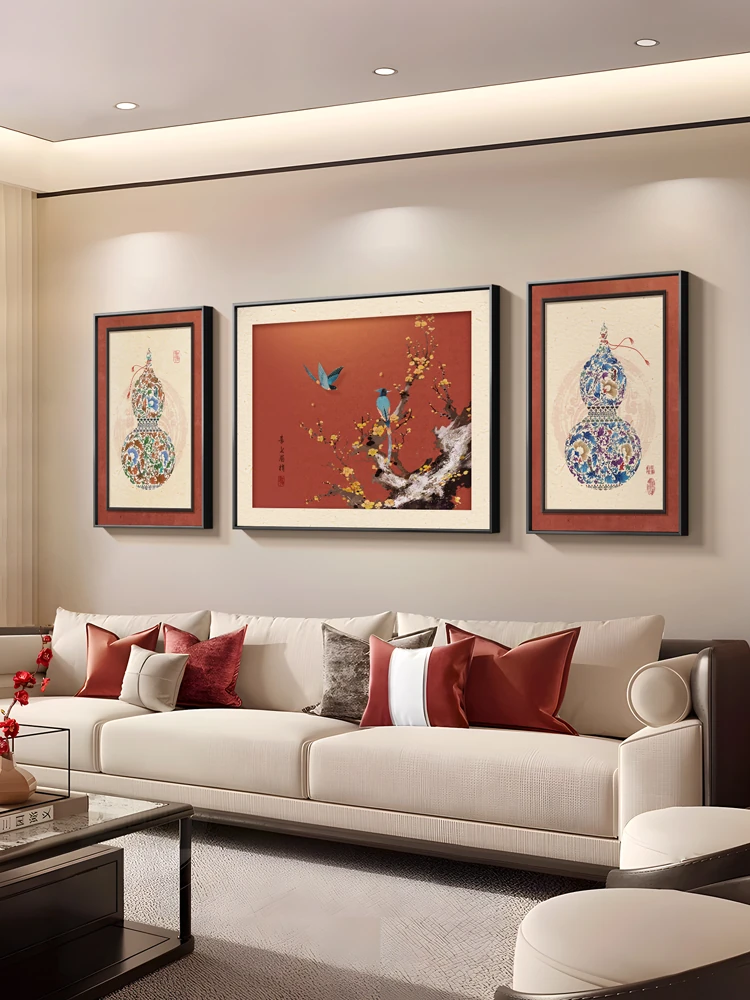 Elegant Chinese-style Living Room Decorative Painting - High-end Floral and Bird Triptych Wall Art for Sofa Background, Featuring Gourd Design