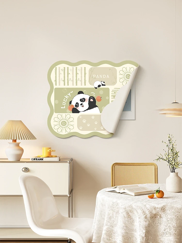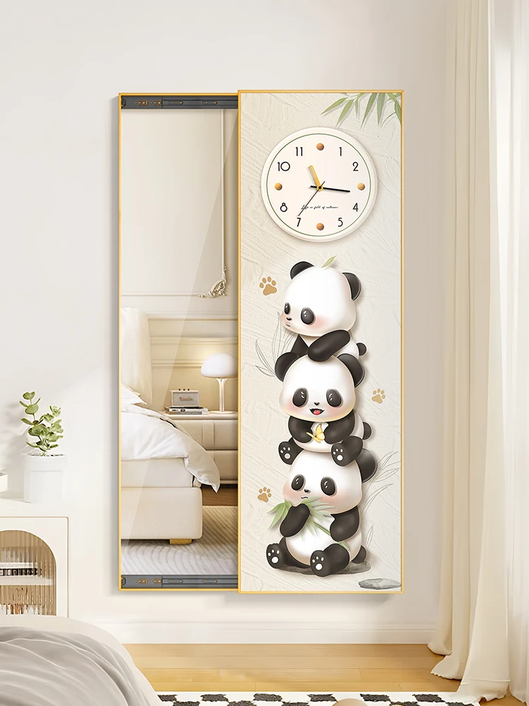 Creamy Style Panda Decorative Wall Art with Hidden Sliding Full-Length Mirror - Perfect for Bedroom Dressing, Featuring a Stylish Wall Clock and Unique Artwork