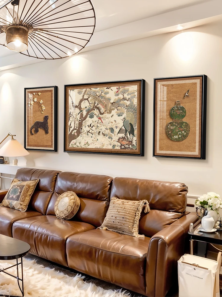 Elegant French Vintage Leopard Art for Living Room – Stunning Three-Piece Modern Chinese Style Wall Decor, Perfect for Sofa Background, Symbolizing Prosperity and Grace
